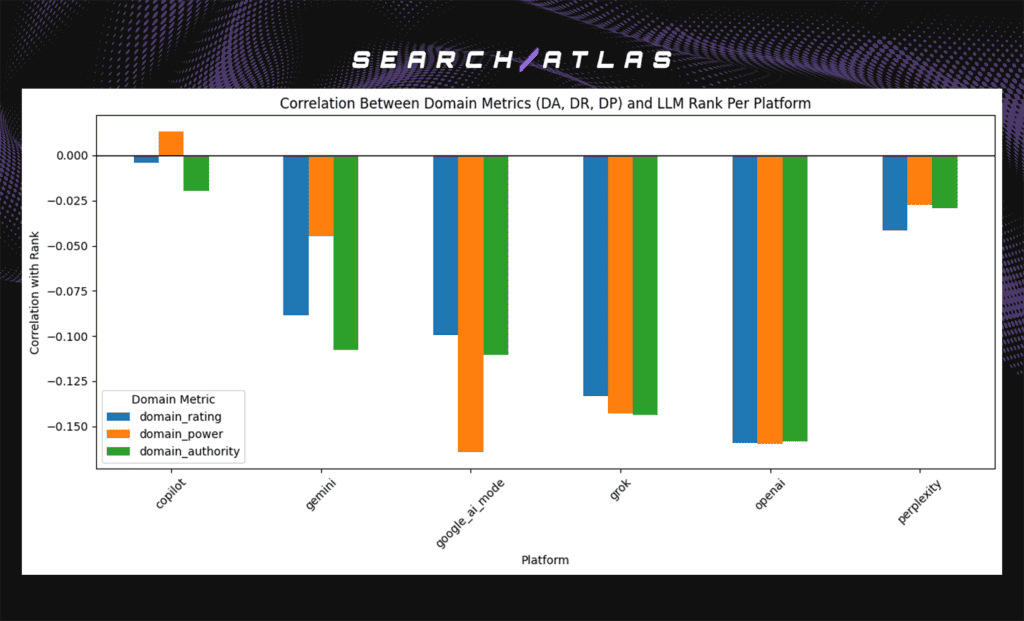- OpenAI, Grok, and Google AI Mode exhibit the strongest negative relationships, suggesting that traditional SEO authority signals play a limited role in how these platforms order citations.