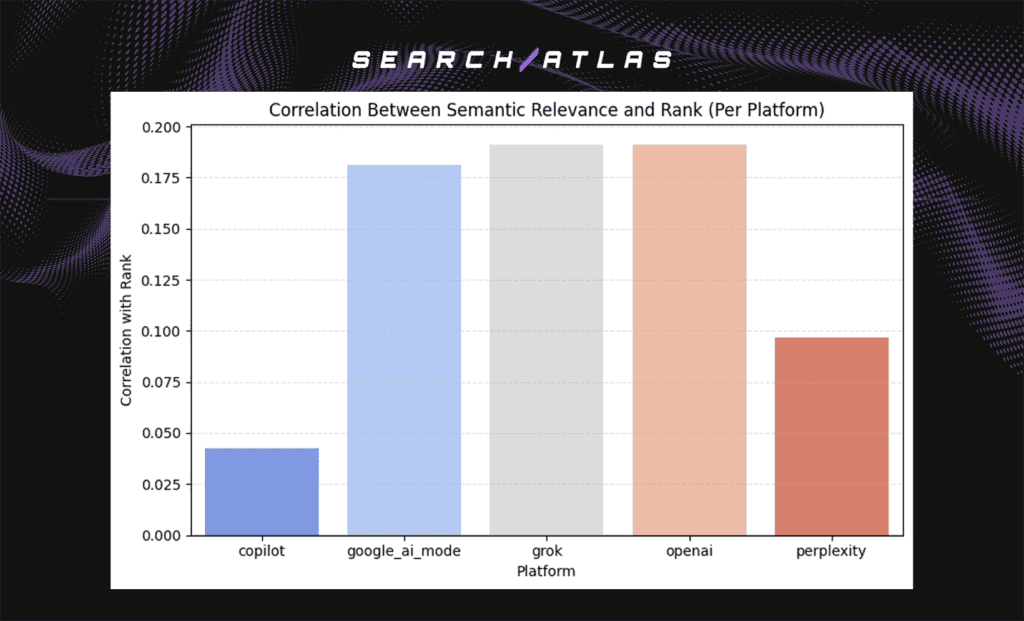 - Perplexity shows a weaker but still positive correlation (~0.10), indicating that relevance influences ranking, but less strongly than for OpenAI, Grok, or Google AI Mode.
