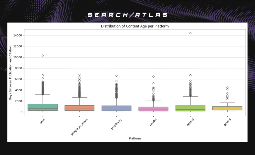 - Across platforms, the median content age typically falls within 3–4 years, with a long tail of much older citations indicating occasional reliance on legacy web material.