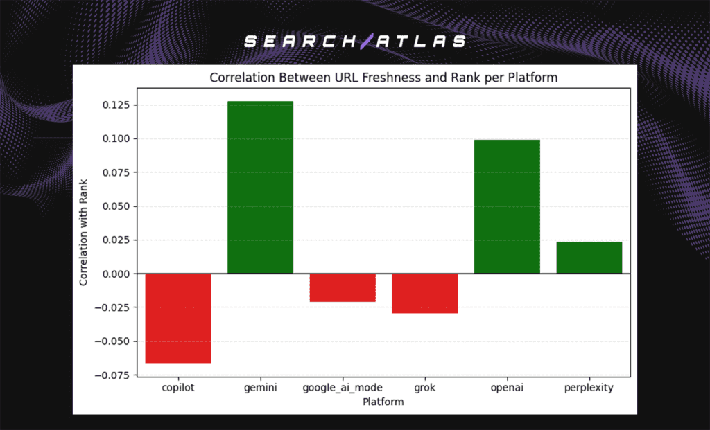 - Copilot, Grok, and Google AI Mode show negative correlations, indicating they do not prioritize freshness, and their top-ranked citations often include older or evergreen pages.