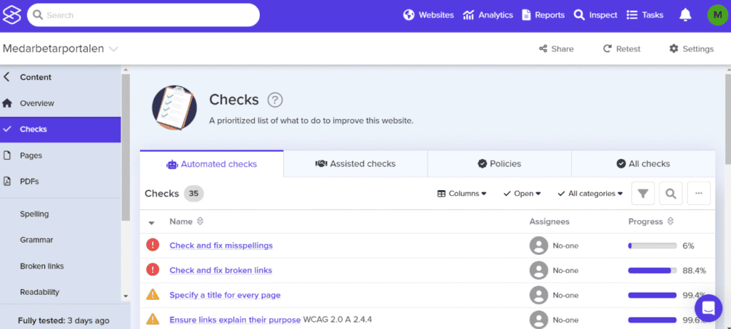 Unlike Siteimprove, Monsido delivers deeper compliance management and content quality monitoring. Monsido focuses on automated policy-based scans, detailed remediation workflows, and structured governance tools that keep enterprise sites aligned with accessibility and brand requirements.