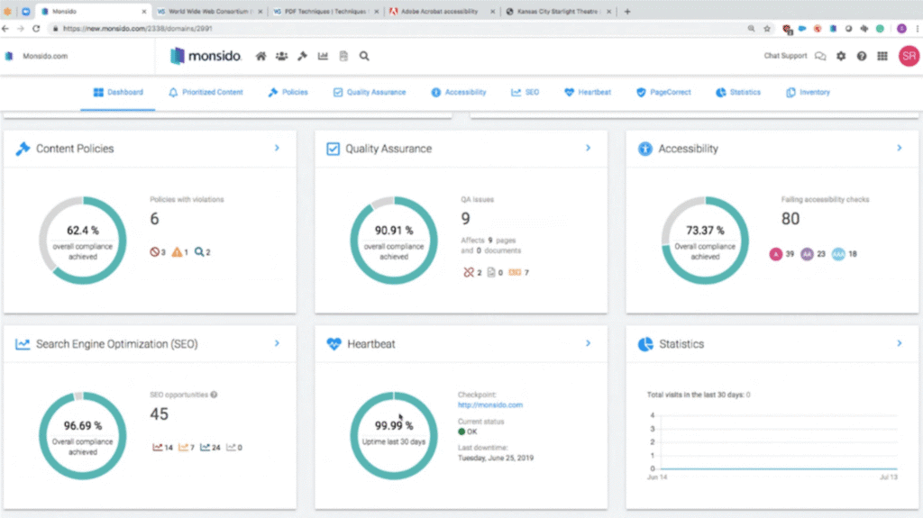 Core features in Monsido include automated accessibility checks aligned with WCAG 2.1 and ADA, broken link detection, spelling and content checks, SEO monitoring, and performance auditing. The platform provides analytics dashboards, issue prioritization tools, and workflows that streamline corrective actions at scale.