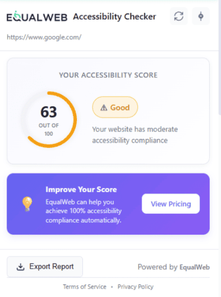 EqualWeb Accessibility Scanner is a cloud-based auditing tool that evaluates entire websites for accessibility issues based on WCAG 2.2 AA standards. EqualWeb identifies violations, highlights problem areas, and provides detailed instructions for correcting accessibility barriers.