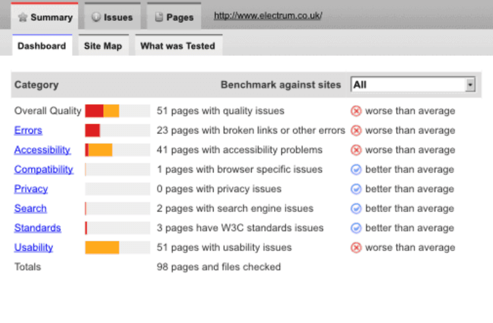 SortSite is an automated website testing tool that scans full sites for issues affecting usability, accessibility, browser compatibility, and overall quality. SortSite provides one-click scanning that generates detailed reports, from high-level summaries to line-level issue indicators.